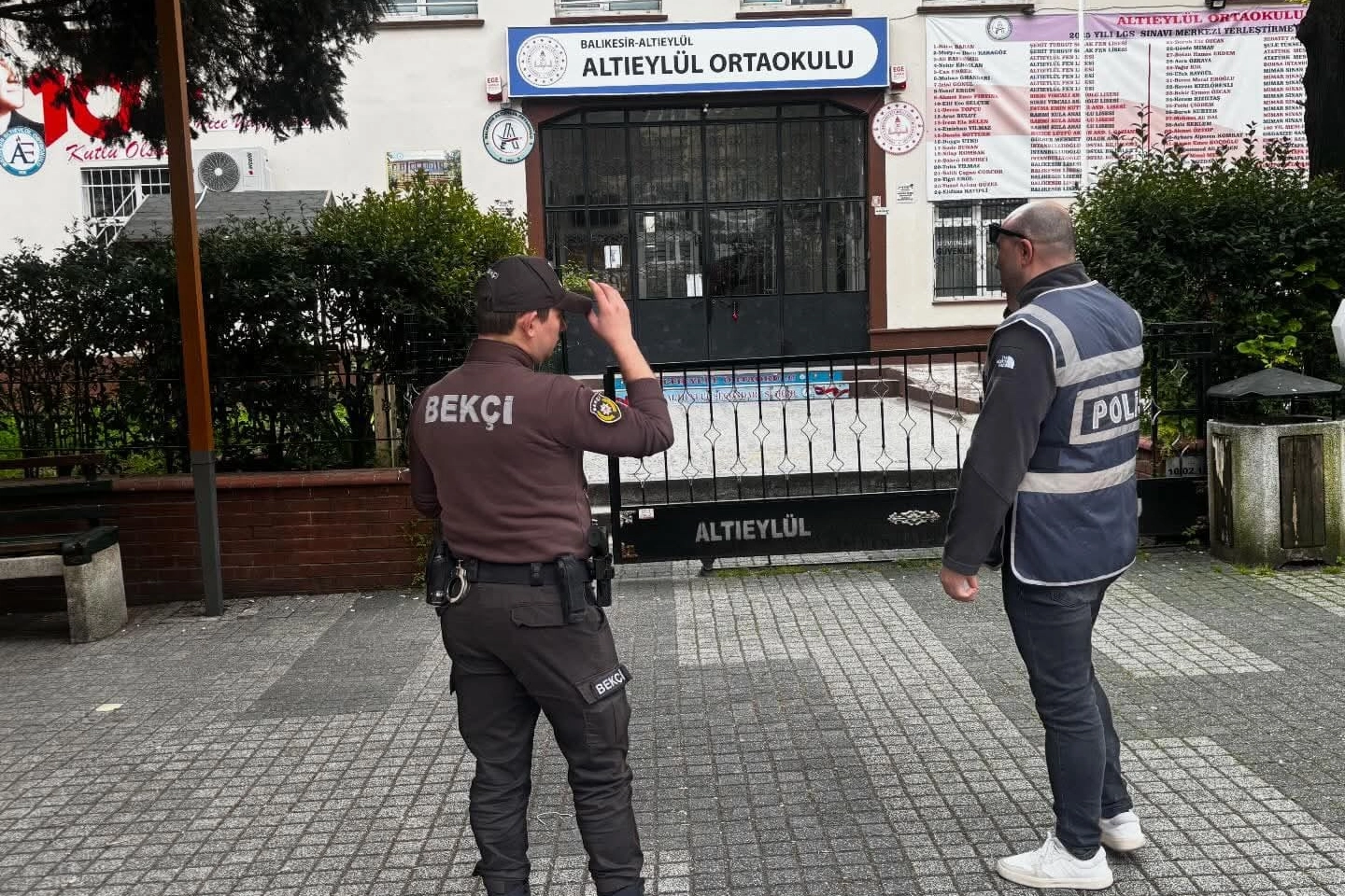 Son günlerde okullarda yaşanan olayların ardından Balıkesir İl Emniyet Müdürlüğü ekipleri, okul giriş ve çıkış saatlerinde yoğun denetim gerçekleştiriyor. Polis ekiplerinin yanı sıra mahalle bekçileri de okul çevrelerinde devriye faaliyetlerini artırarak olası risklere karşı önlem alıyor.