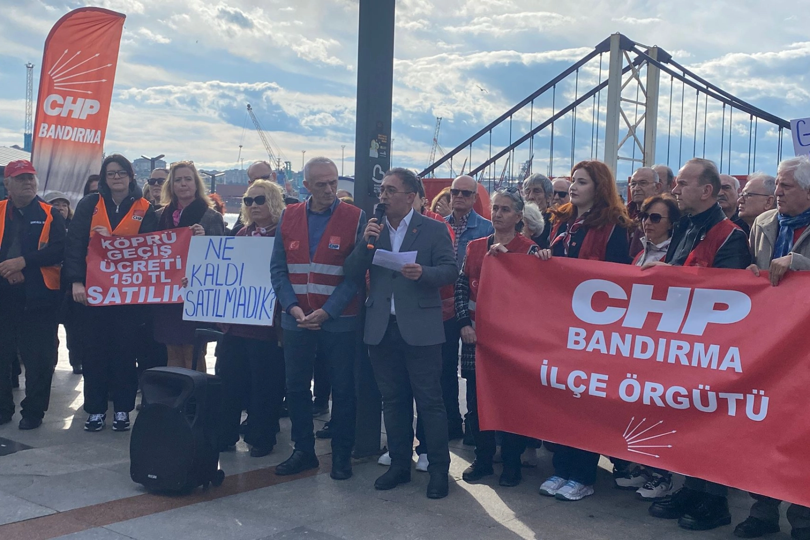 Cumhuriyet Halk Partisi Bandırma İlçe Teşkilatı, köprü ve otoyolların satışını protesto etmek amacıyla Sahil Bandı Köprü önünde basın açıklaması yaptı. Açıklamayı İlçe Başkanı Mehmet Atak gerçekleştirdi.