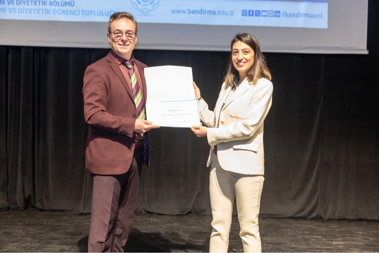 Etkinlik sonunda Beslenme ve Diyetetik Bölüm Başkanı Prof. Dr. Uğur Günşen tarafından Dr. Öğr. Üyesi Kübra Damla Ekenci’ye teşekkür belgesi takdim edildi. Program, günün anısına çekilen hatıra fotoğrafının ardından sona erdi.