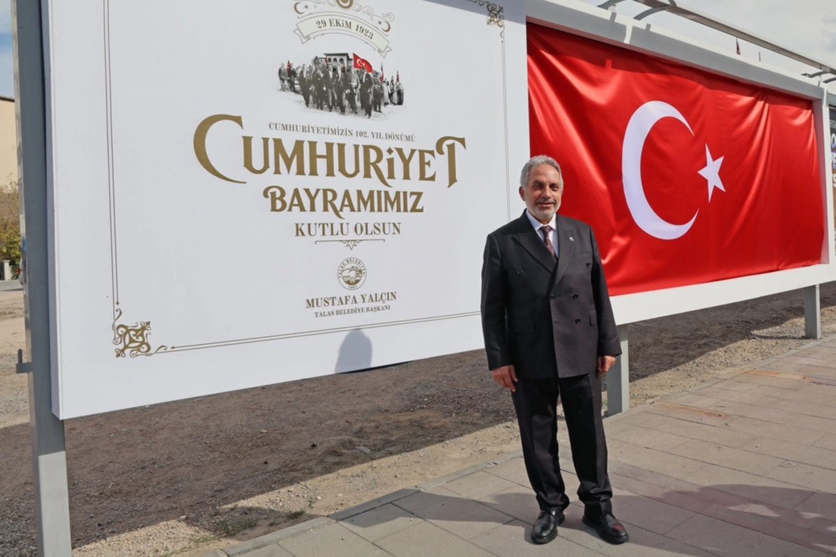 Kayseri Talas Belediye Başkanı Mustafa Yalçın’ın özel olarak hazırlattığı tasarımda, üç boyutlu Türk bayrağı yer aldı. Bayrağın yanında ise “Cumhuriyet Bayramımız Kutlu Olsun” mesajı, estetik çizgiler ve Cumhuriyet’in ilanını simgeleyen görsellerle birlikte sergilendi.