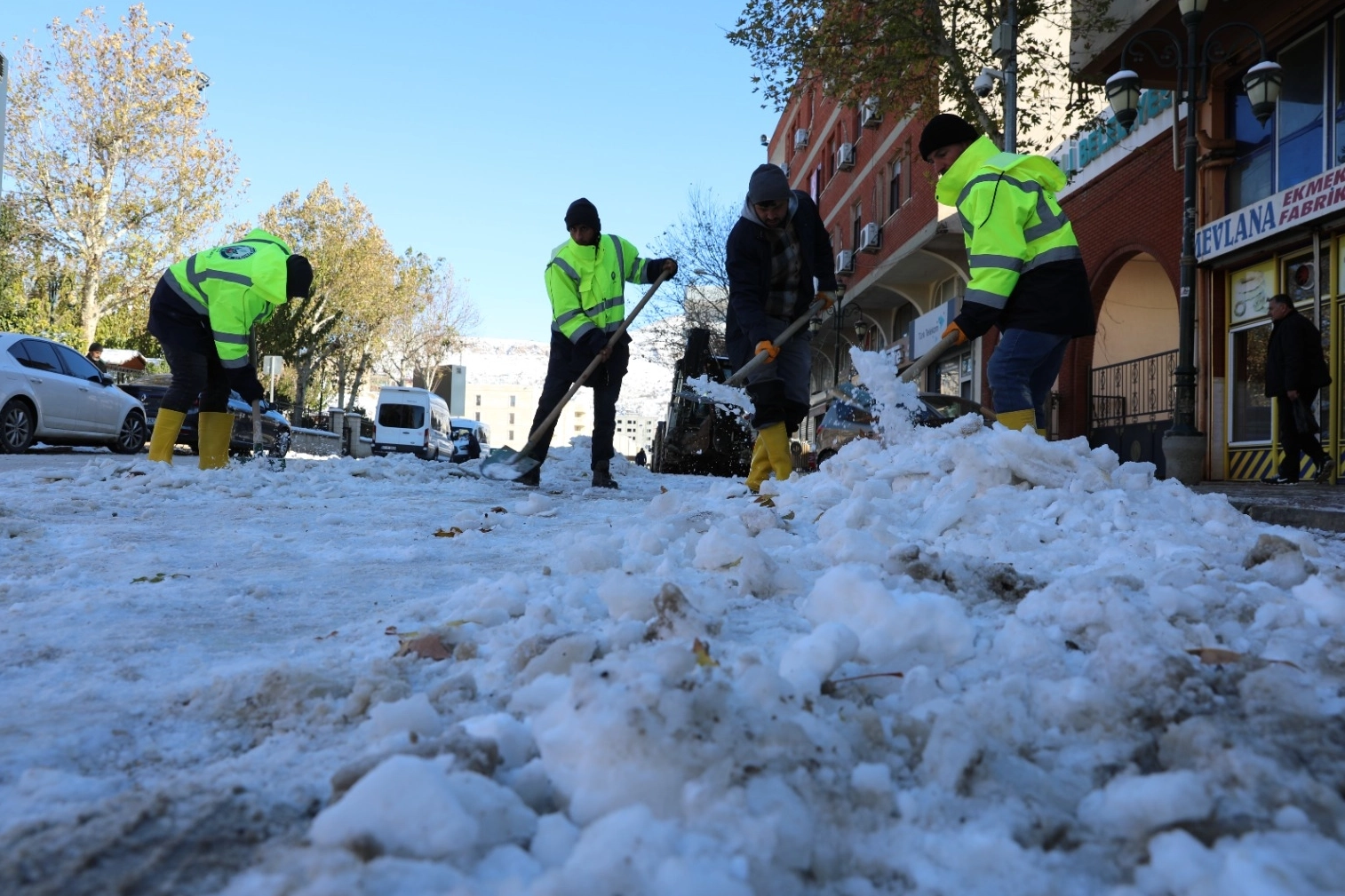 Mardin genelinde kar yağışının etkisiyle beyaza bürünen manzaralar dikkat çekerken, belediye ekiplerinin kar küreme ve tuzlama araçlarıyla mücadelesi sürüyor.