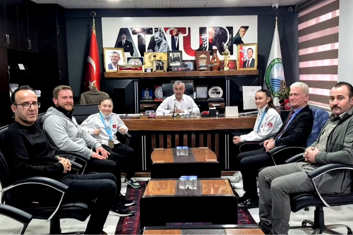 Türkiye Minikler ve Yıldızlar Şampiyonası’nda başarılı olan Özen Egemen Efe Er, Ceydanur Mira Ören ve Abdullah Şimşek, Manyas Belediye Başkanı Ahmet Duru’yu makamında ziyaret etti.