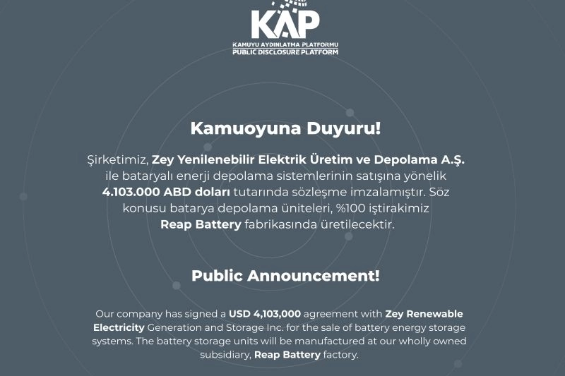YEO Teknoloji, enerji depolama alanındaki büyümesini sürdürüyor. Şirket ile Zey Yenilenebilir Elektrik Üretim ve Depolama A.Ş. arasında, bataryalı enerji depolama sistemlerinin satışına yönelik 4.103.000 ABD doları tutarında önemli bir sözleşme imzalandı.