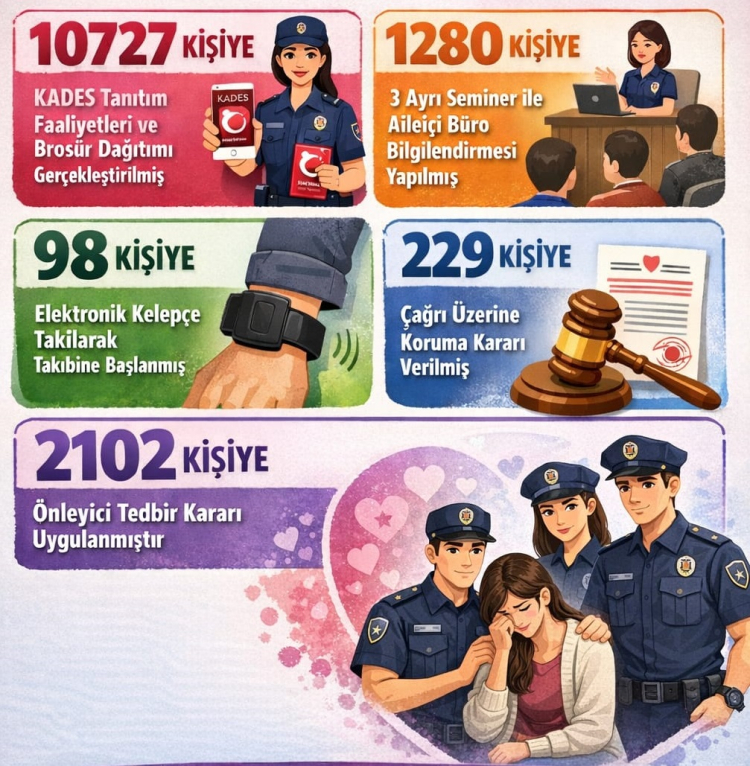Aile İçi Büro tarafından gerçekleştirilen 3 farklı seminer aracılığıyla 1.280 kişiye ulaşıldı. Şiddetin önlenmesine yönelik uygulamalar kapsamında 98 kişi elektronik kelepçe takılarak izlemeye alındı. Ayrıca 229 kişi için çağrı üzerine koruma kararı çıkarılırken, 2 bin 102 kişi hakkında önleyici tedbir kararı uygulandı.