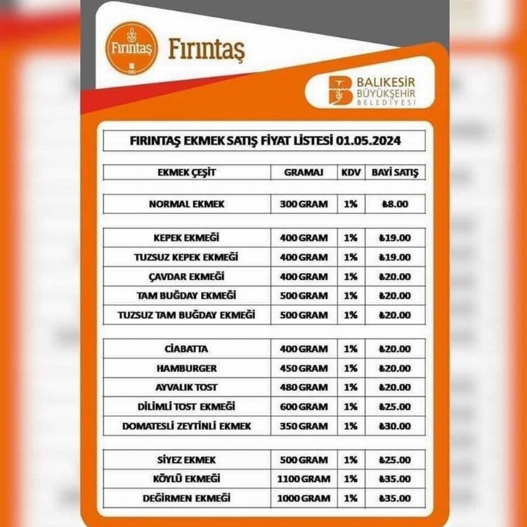 Balıkesir Büyükşehir Belediyesi’nin iştiraki olduğu Fırıntaş’ta fiyat güncellemesi gerçekleştirildi. Balıkesir genelinde uygun fiyatlı ekmek satışı yapan Fırıntaş ürünlerinin fiyatı 2024 yılının başında güncellenmişti. 2024 Mayıs ayı itibariyle fiyat listesi güncellenerek bazı ürünlerde fiyat artışına gidildi. 300 gram normal ekmek fiyatı aynı kalırken 400 gram kepek ekmeği ve tuzsuz kepek ekmeği 13 liradan 19 liraya çıktı. Çavdar ekmeği, tam buğday ekmeği ve tuzsuz tam buğday ekmeği fiyatları ise 14 liradan 20 liraya yükseldi. Ciabatta ekmeği, hamburger ekmeği ve Ayvalık Tost ekmeği fiyatları aynı kalarak 20 liradan ve dilimli tost ekmeği 25 liradan satışa çıktı. Fiyat listesine yeni eklenen domatesli zeytinli ekmek fiyatı 30 lira olarak belirlendi. 25 liradan satılan Siyez ekmek fiyatı aynı kalırken köylü ekmeği ve değirmen ekmeğinin fiyatı 35 lira oldu. /Mihriban Nur Uysun