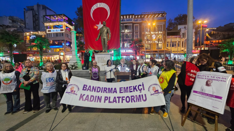 Bandırma Emekçi Kadın Platformu meydanda basın açıklaması yaptı. Bandırma Kadın Dayanışması Başkanı Nilgün Germiyan, Kadın-Der Başkanı Esen Ersoy ve Kent Konseyi Kadın Meclisi ile Bandırma Muhtarlar Derneği Başkanı Nur Hancıoğlu, kadına yönelik şiddetin boyutlarına, artan tehditlere ve derinleşen toplumsal eşitsizliklere dikkat çekti.