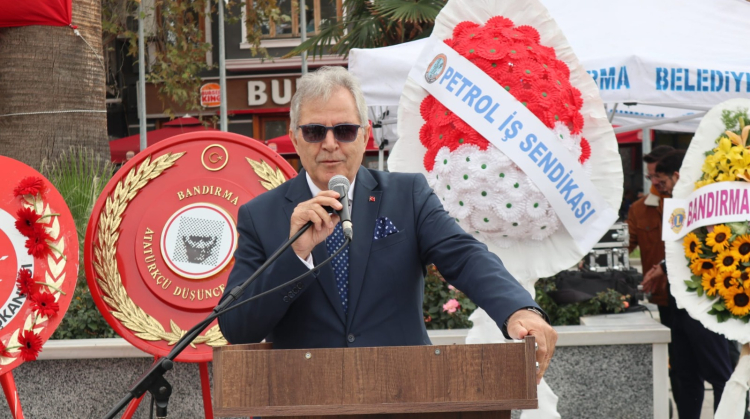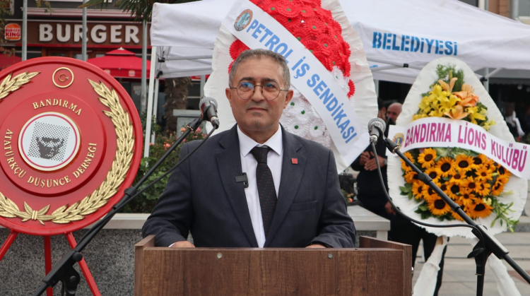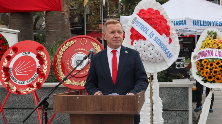 Cumhuriyet'in 102. yılında Bandırma’da bu kutlamayı yapmaktan büyük bir onur duyduğunu söyleyen CHP Bandırma İlçe Başkanı Mehmet Atak, “Sonsuza dek var olacak olan Cumhuriyet Meydanı'nda atamızın önünde sizlere seslenmenin onur ve gururunu yaşamaktayım. Bandırmamız bir Cumhuriyet kentidir. Özgürlüğün kentidir. Sevginin, barışın, tüm ülke değerlerinin anlam bulduğu, yaşatıldığı kentin ismidir. Cumhuriyet vazgeçilmezdir. Gazi Mustafa Kemal Atatürk kırmızı çizgisidir. Sosyal hayat, farkındalıklar etle tırnak gibi kopamayacağı, olmazsa olmazıdır. Güzel olan ne varsa Cumhuriyet Cumhuriyet ile içine almış, onu sımsıkı sararak kurmuş bir kentin adıdır Bandırma. Bu bağlamda her şeyden çok demokrasi demektir. Insanca ve adil bir yaşamın adıdır. Hukukun üstünlüğüdür. Laikliğin teminatıdır. Kadınların özgürlük güvencesidir. Herkesin yaşam biçimine saygıdır. Fırsat eşitliğidir. Cumhuriyet bugün tüm dünyada en çok ihtiyacımız olan kavramın adıdır. Yurtta barış, dünyada barış demektir." diye konuştu.