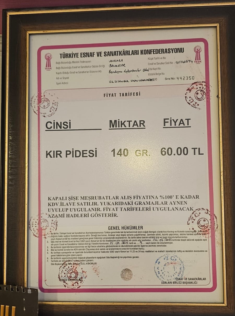 Bandırma Lokantacılar Odası'na kayıtlı işyerlerinde çerçeve içinde asılı olan resmi fiyat tarifesinde, "Kır Pidesi 140 gr – 60 TL" olarak yer aldı. Belgeye göre bu fiyat, azami satış sınırını oluşturuyor ve tüm esnaflar için bağlayıcı bir üst sınırı ifade ediyor.