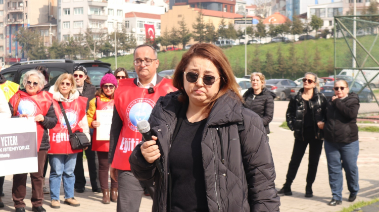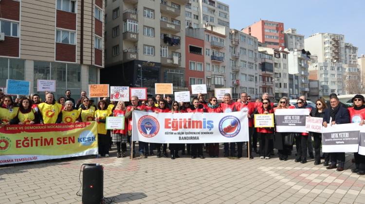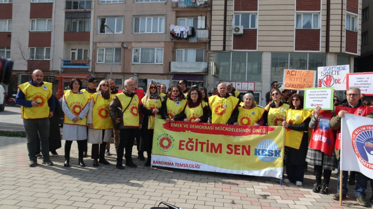 Eğitim Sen Bandırma Temsilcisi Bülent Akhan ise yaptığı konuşmada okullarda artan şiddet vakalarına dikkat çekerek, “Bugün burada yalnızca aramızdan koparılan arkadaşımız için değil, yıllardır göz ardı edilen itibarımız ve can güvenliğimiz için toplandık. Okullarda artan şiddet vakaları uzun süredir ciddi bir tehdit oluşturmaktadır. Yaptığımız uyarıları dikkate almayarak, kalıcı ve önleyici politikalar hayata geçirmeyen Milli Eğitim Bakanlığı bu olayın birinci derecede sorumlusudur. Somut ve kalıcı adımlar atılmadığı için şiddet ortamı giderek derinleşmiştir. Bir okulda kesici aletle saldırı gerçekleştirilebilmesi, güvenlik mekanizmalarının yetersizliğini açıkça ortaya koymaktadır. Okullarda şiddeti önleyici destek mekanizmaları ciddi biçimde gözden geçirilmelidir. Şiddetin zemini yalnızca bireysel bir öfke değildir. Medyada, siyasette ve bürokraside giderek meşrulaştırılan sert ve kutuplaştırıcı dil; eğitim emekçilerini hedef gösteren, itibarsızlaştıran ve yalnızlaştıran söylemler bu iklimi beslemektedir.” dedi.