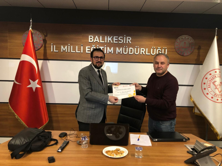 Balıkesir İl Millî Eğitim Müdürlüğü toplantı salonunda düzenlenen etkinliğe, İl Millî Eğitim Şube Müdürü Hasan İnanç da katılarak öğretmenlerin heyecanına ortak oldu. Program sonunda Şube Müdürü, değerli katkıları ve etkileyici sunumu dolayısıyla Doç. Dr. Ahmet Ali Çanakçı'ya teşekkür ederek kendisine belge takdiminde bulundu.