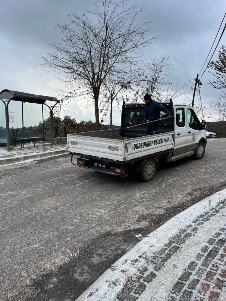 Dursunbey Belediyesi, olumsuz hava koşullarının etkilerine karşı ilçe genelinde önlemler aldı. Ulaşım güvenliğinin sağlanması amacıyla belirlenen riskli güzergâhlarda tuzlama çalışması yapıldı.