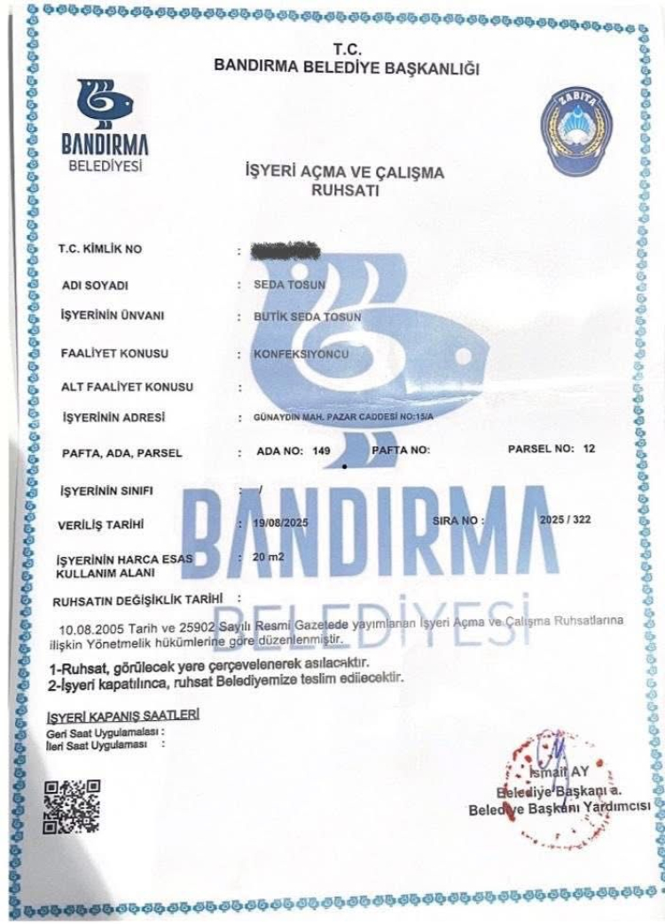 Paylaştığım resimlerde de görüldüğü üzere eşim adres değişikliğini yaptıktan sonra 19.08.2025 tarih ve 2025/322 sıra nolu İş Yeri Açma ve Çalışma Ruhsatını alarak ticari faaliyetlerine devam etmektedir.