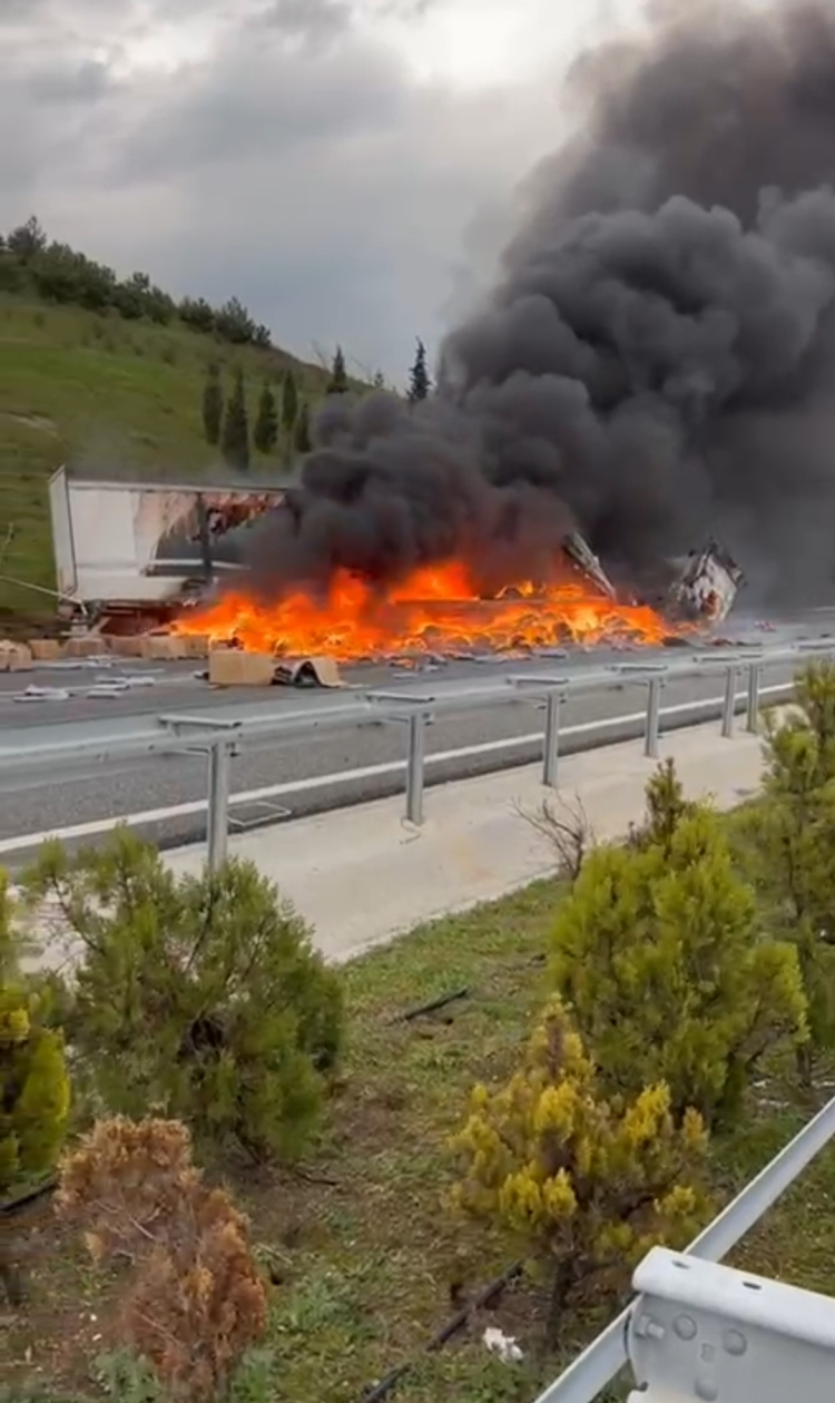 İstanbul istikametinde seyir halinde olan aracın sürücüsünün direksiyon hakimiyetini kaybetmesi sonucu meydana gelen kazada, çarpışmanın etkisiyle İzmir istikametine geçen tır alev aldı.