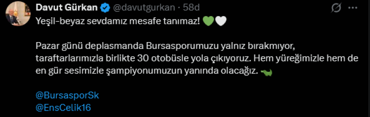 AK Parti Bursa İl Başkanı Davut Gürkan da konuya ilişkin yaptığı ayrı paylaşımda, taraftara güçlü destek mesajı verdi. Gürkan, “Yeşil-beyaz sevdamız mesafe tanımaz. Pazar günü deplasmanda Bursasporumuzu yalnız bırakmıyor, taraftarlarımızla birlikte 30 otobüsle yola çıkıyoruz. Hem yüreğimizle hem de en gür sesimizle şampiyonumuzun yanında olacağız” dedi.