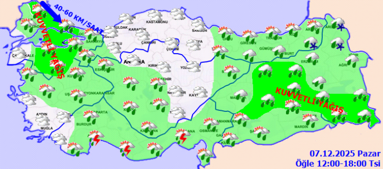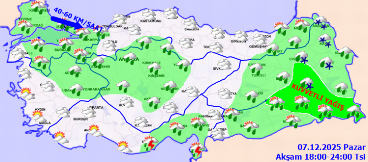 Yağışların geneli yağmur ve sağanak şeklinde görülürken, Akdeniz kıyılarında yer yer gök gürültülü sağanak, Doğu Karadeniz’in iç kesimlerinin yüksekleri ile Doğu Anadolu’nun kuzey ve doğusunda ise karla karışık yağmur ve kar öngörülüyor.
