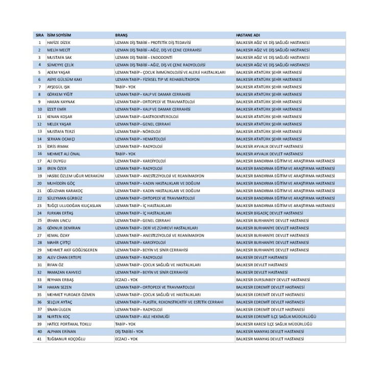 Aydemir, yeni atamalarla birlikte Balıkesir’de Radyoloji, Ortopedi ve Travmatoloji, Anesteziyoloji ve Reanimasyon, Çocuk Sağlığı ve Hastalıkları, Genel Cerrahi, İç Hastalıkları, Kadın Hastalıkları ve Doğum, Kalp ve Damar Cerrahisi, Kardiyoloji, Plastik Cerrahi, Nöroloji, Fizik Tedavi, Deri ve Zührevi Hastalıkları, Aile Hekimliği, Gastroenteroloji, Hematoloji ve Çocuk İmmünolojisi gibi birçok branşta hekimlerin göreve başladığını vurguladı.