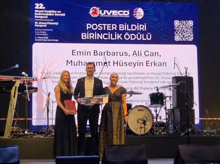 Balıkesir Üniversitesi Tıp Fakültesi Kalp ve Damar Cerrahisi Anabilim Dalı, ulusal ölçekte önemli bir başarıya imza attı. Dr. Öğr. Üyesi Emin Barbarus, Dr. Öğr. Üyesi Muhammet Hüseyin Erkan ve Arş. Gör. Dr. Ali Can’ın katkılarıyla hazırlanan “The Role and Power of Ultrasound in AV Fistula Planning in Hemodialysis Patients” başlıklı akademik çalışma, 6-9 Kasım 2025 tarihlerinde Antalya’da gerçekleştirilen 22. Ulusal Vasküler ve Endovasküler Cerrahi Kongresi’nde birincilik ödülü aldı.