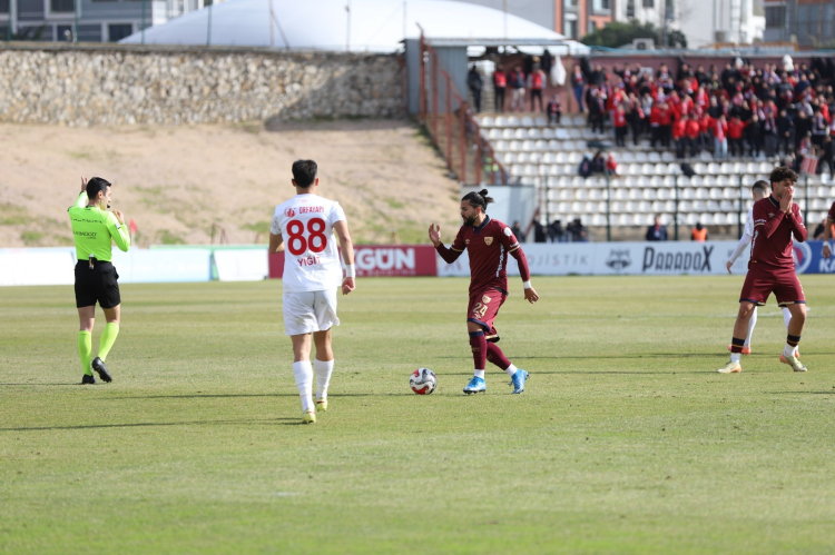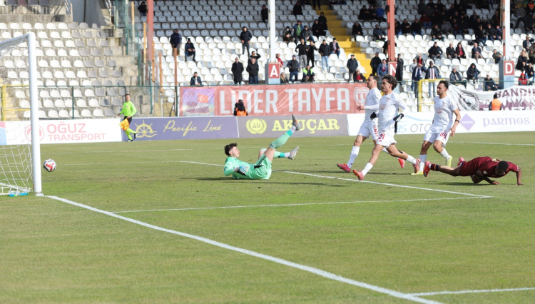44. dakika Bandırmaspor etkili geldi. Kaleci Arda’nın uzun gönderdiği topu rakip yarı alanda kontrol eden Tanque, topla birlikte ilerledikten sonra sol ayağıyla sert vurdu. Ancak şut savunmadan geri döndü.